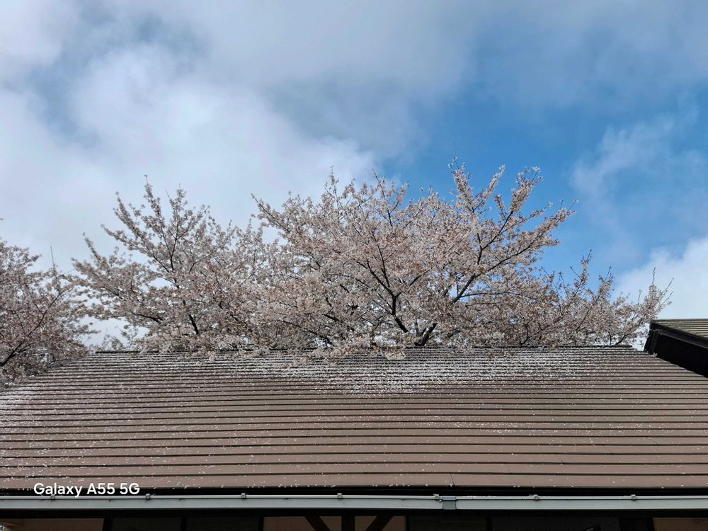 青空とサクラ🌸と屋根、屋根に散った花びら。