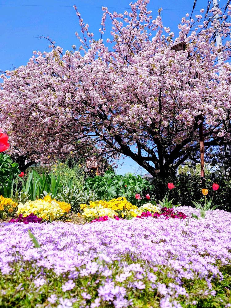 満開の桜に花壇にはチューリップとパンジーそして芝桜の花が咲いています。