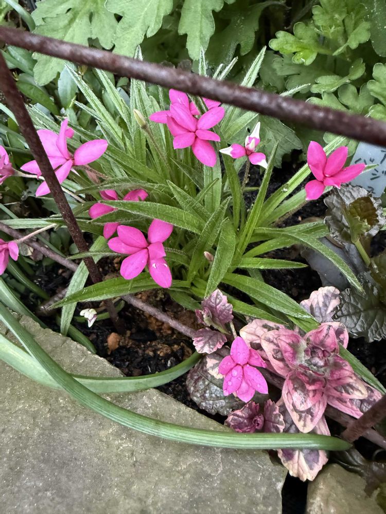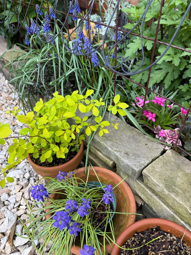 チマっとしたアッツ桜がムスカリや鉢植えのコデマリと良い感じ。