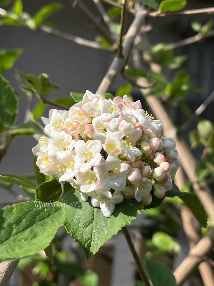 少しピンクを帯びた白い小花が集まって10センチほどの手毬状になっています🌼