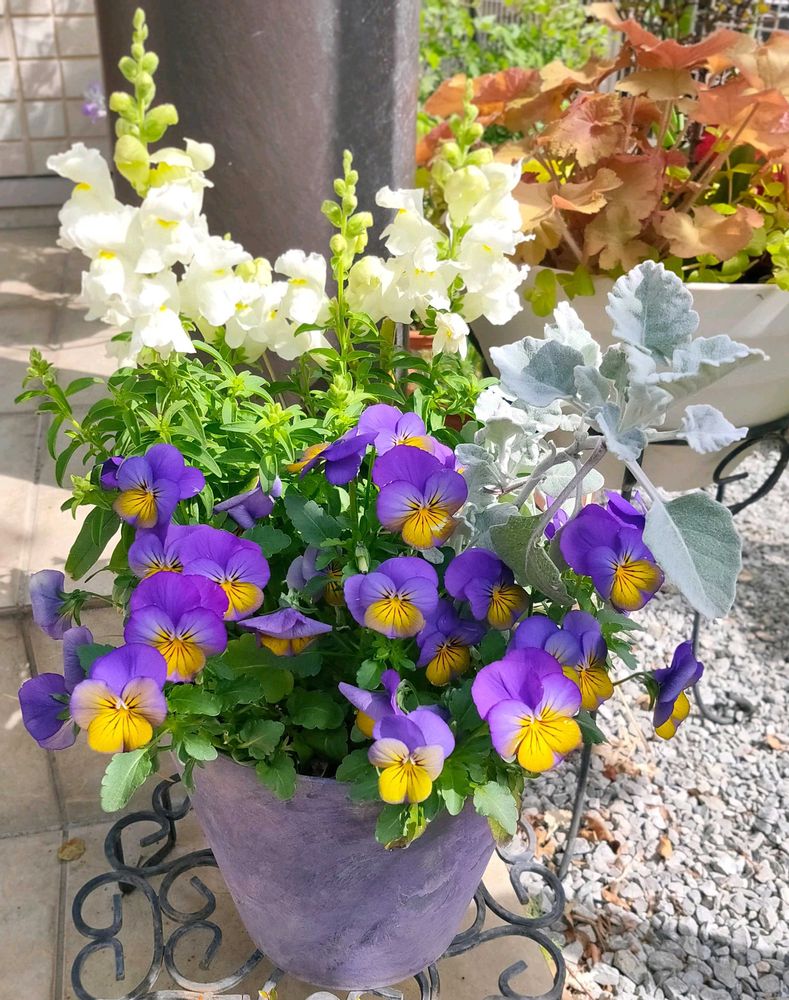②ビオラはそろそろクライマックス。やっとやる気を出してきたキンギョソウとコラボしています。