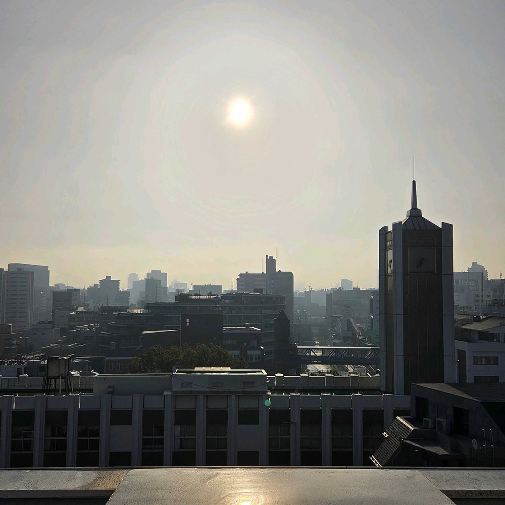 今朝は霧が出て霞んで見える空に鈍く朝陽が