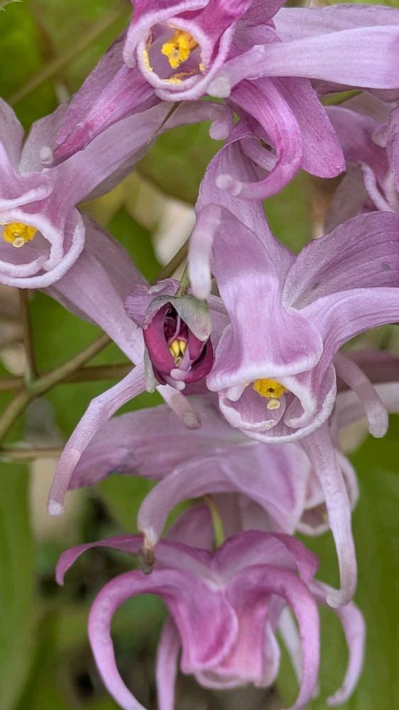 2枚ずつ向き合って筒状に並んだのが花弁で、そこから四方に伸びる長いイカリ状の距の先には、蜜が詰まっている 距が好き♡🏷