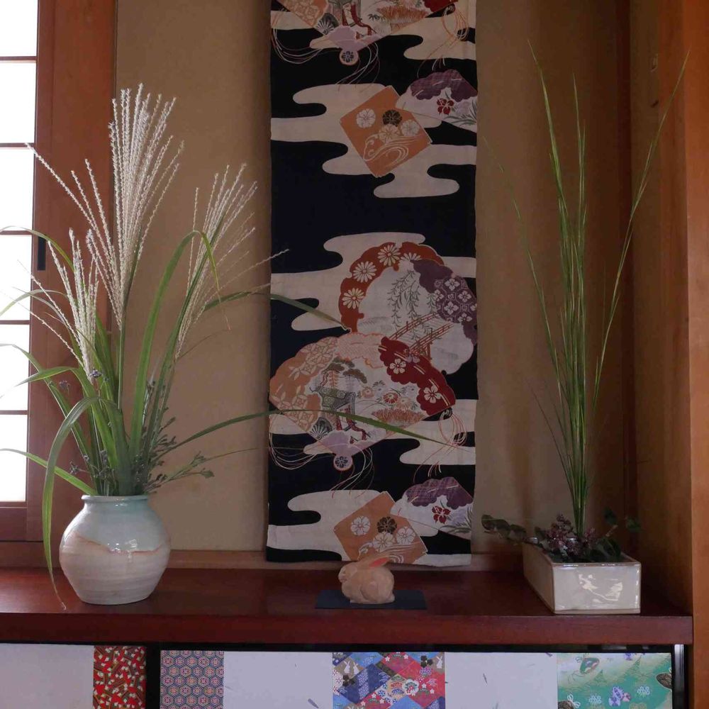 これ、祖母が使っていた名古屋帯なんです。結構古くて虫食いもあるので、テーブルセンターにでも作り直そうかと思ってましたが、このままタペストリーとして使ってもいいかもですね。☺️