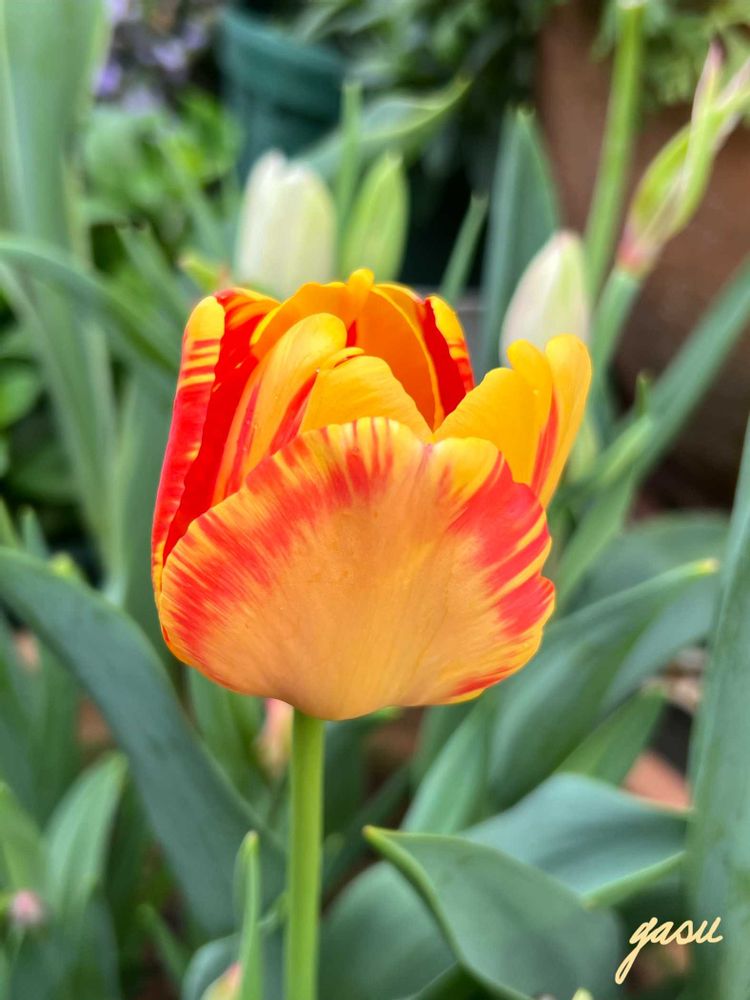⑤チューリップも終盤ですが、こちらは最後の一輪。後ろは1番遅咲きになって今頃蕾を上げて来た枝咲きさん🌷 週末には咲いてくれそうです😉