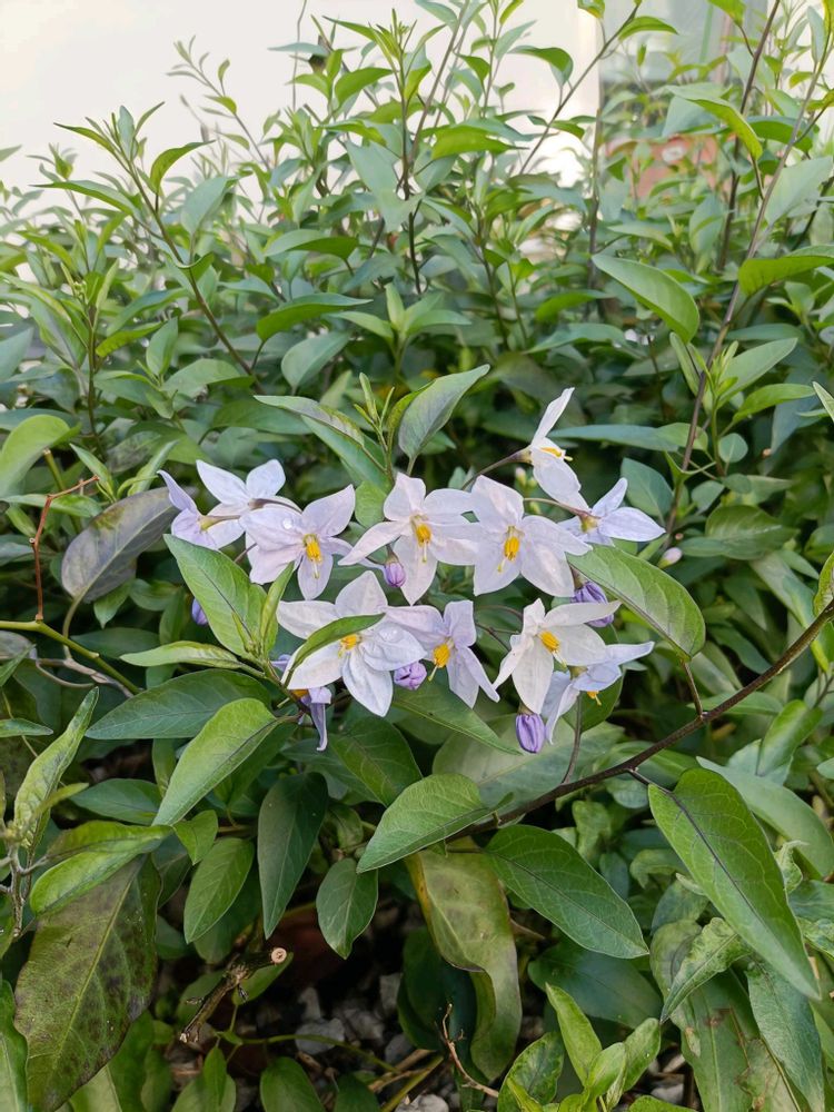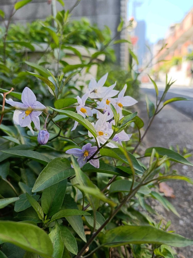 ナスの花に似た径2.5cmほど星形の小花。5枚の花弁が合着。雄蕊5(黄色)、雌蕊1(花柱は白、柱頭は緑)。