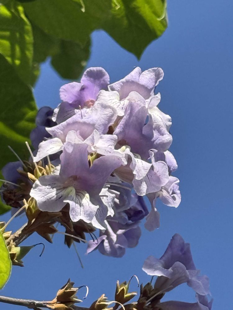 Paulownia tomentosa/Paulownia. Paulowniaceae. Lamiales. Magnoliopsida. Tracheophyta Commonly called/Princess tree. Empress tree *Named in hornor of Russian Princess Anna Pavlovna Native to/China. Korea Symbolism/Good fortune. Rebirth *known in Japan as “Kiri” it is used in the crests of the Toyotomi family and is currently the official emblem of the Japanese Prime Minister and go ernment. *Genus of 6 species of deciduous tree *Bright light green leaves, to 12in(30cm)long *Fragrant, pinkish lilac flowers,2in(5cm)long *Named after Anna Pavlona(1795-1865), Princess of Netherlands *The name ‘tomentosa’ is Latin for “hairy” or “covered in hairs”. Photographed 4/14 9:10am 2026 Posted 4/17(Friday) 11:48am 2026