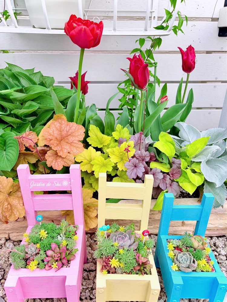 我が家の庭は🌷が咲く時期とこれからの🌹の咲くシーズンが賑やかです😊