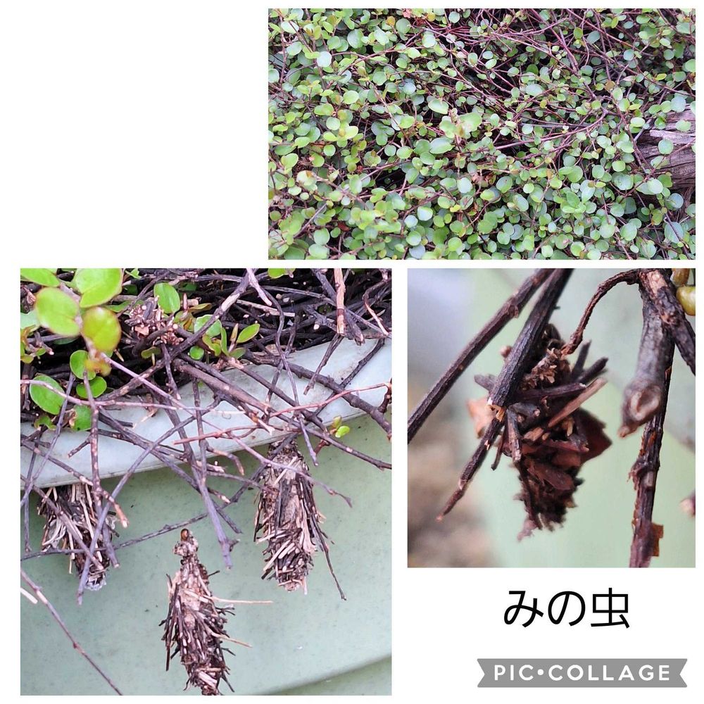 ワイヤープランツをカットしたら植木鉢にぶら下がるみの虫さんが!ベランダにもみの虫さんが居て