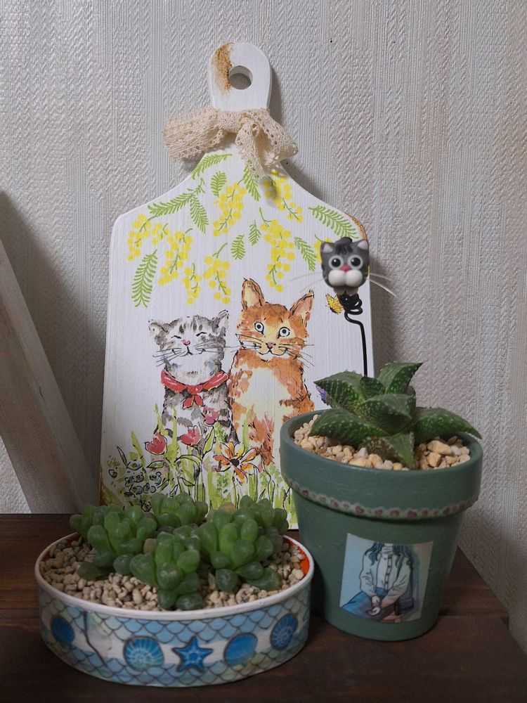 ねこちゃんのイラスト画は、作家さんの絵をデコパージュしたものだそうですよ😊
