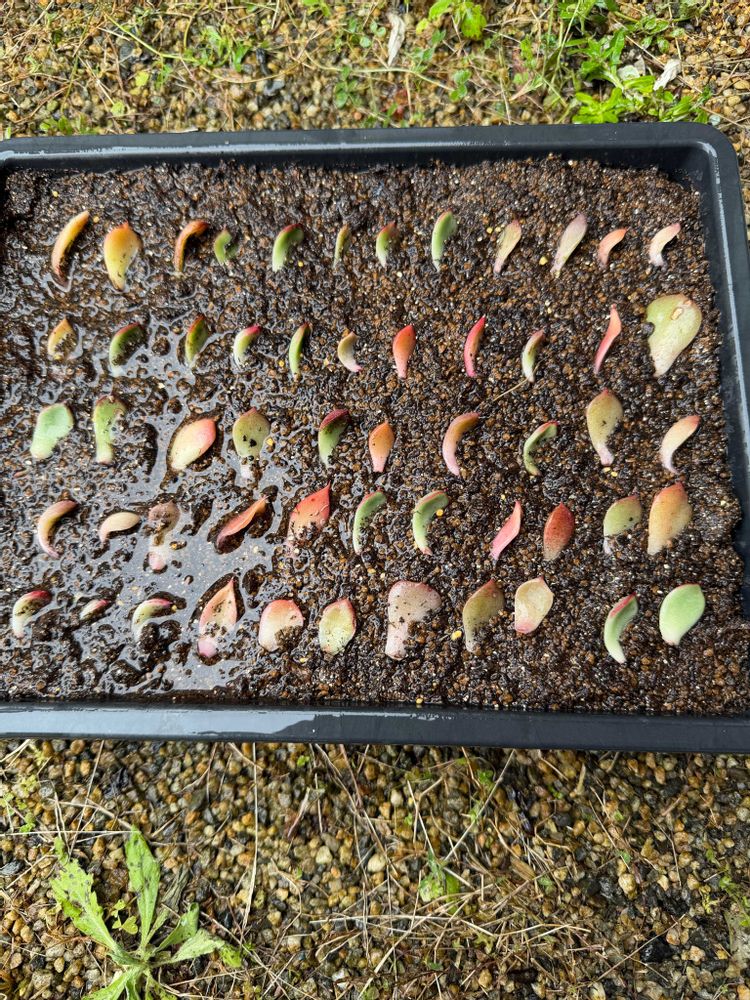 そろそろ葉挿しも何かしらの現象が起きる筈なんですが、まだ湿度が足りないんでしょうね。