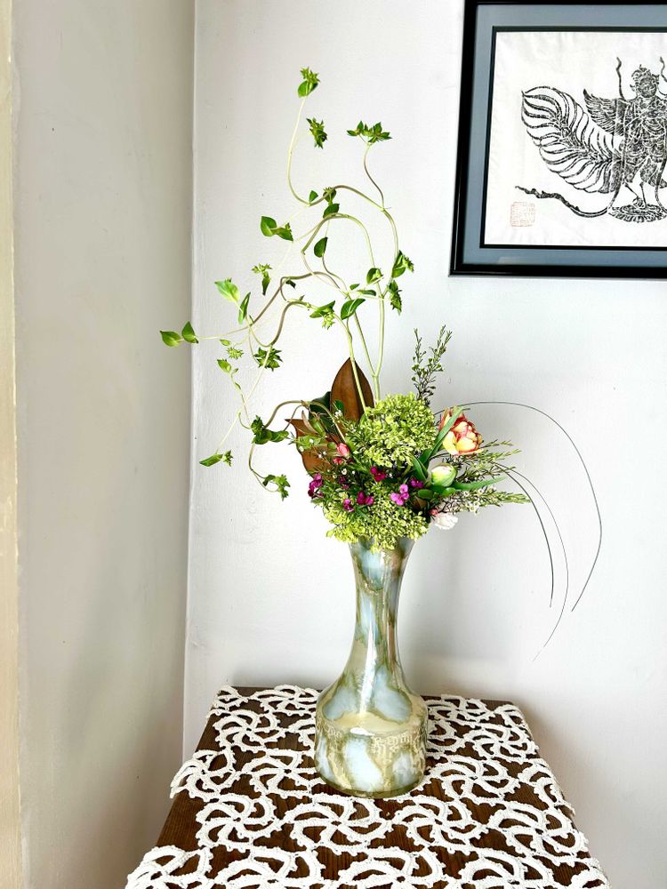 1、残り物の花材で自分の持っている、1番高さのある花瓶に生けました