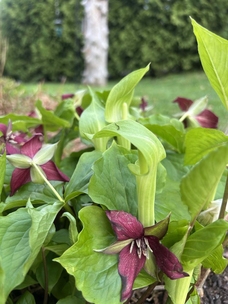 2、野草のエンレイソウとマムシグサは混ざって咲いてます。霜を乗り越えてくれました♪