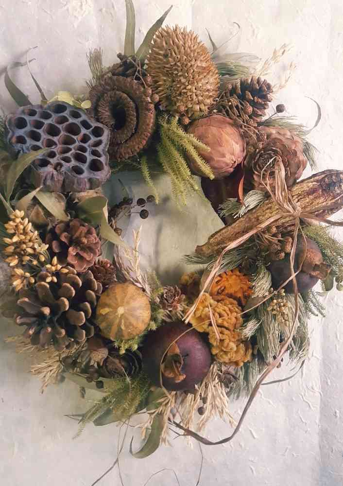 ハス、カボチャ、マツボックリ、ヘチマ、マンゴスチン、サルフレア、ケイトウ…秋に採れる様々な木の実と花を盛り合わせた、豪華なリース。