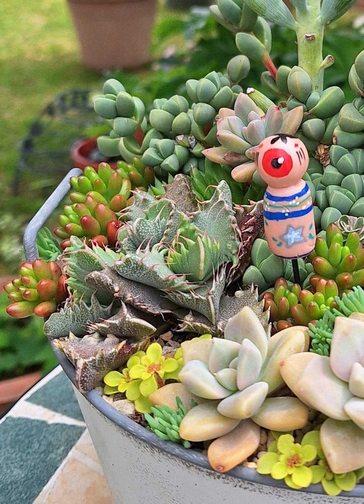 外で冬越しした寄せ植えに、セダムを少し足して撮ってみました❣️
