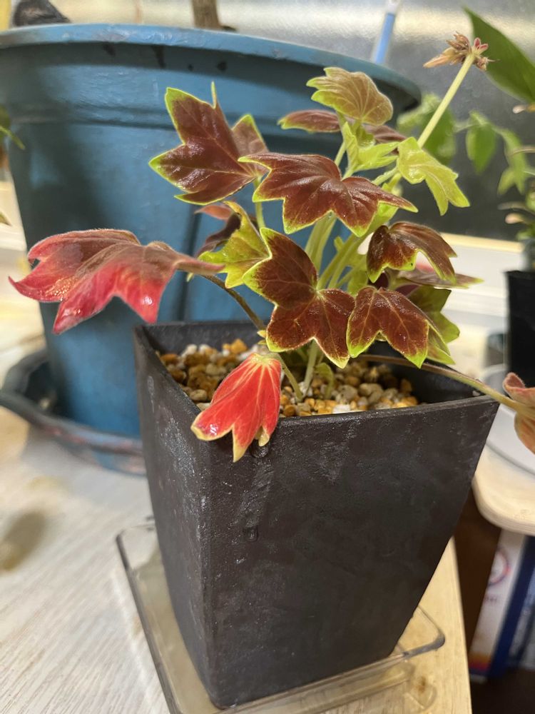 もみじ葉ゼラニウム、紅葉した🍁みたいな見た目がかわいい葉っぱです。アロマオイルのような独特の匂いがしますね、この葉っぱ。あまり好きなタイプの匂いではないけどついつい嗅いでしまう匂い。