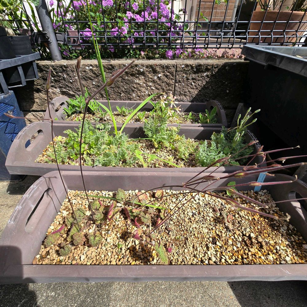 一番奧のプランターはシンニンギア 上海の女王 球根は100個くらい埋まっています😅もはや雑草レベルの繁殖力 花の香りは素晴らしいんですがね…
