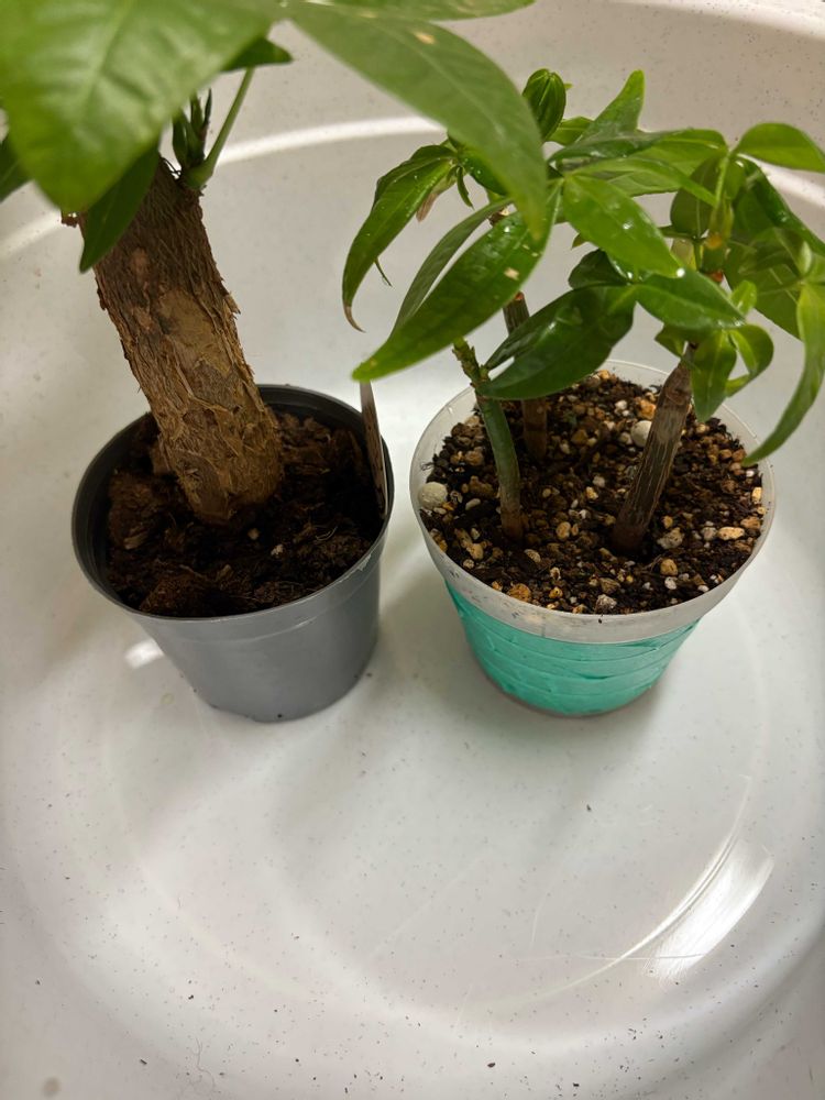 ホームセンターでお安くなっていたパキラがいたのでお迎えしました(1枚目)。比較にダイソーパキラを並べてみました(2枚目)。どちらも枯らさないように育てたいと思います。