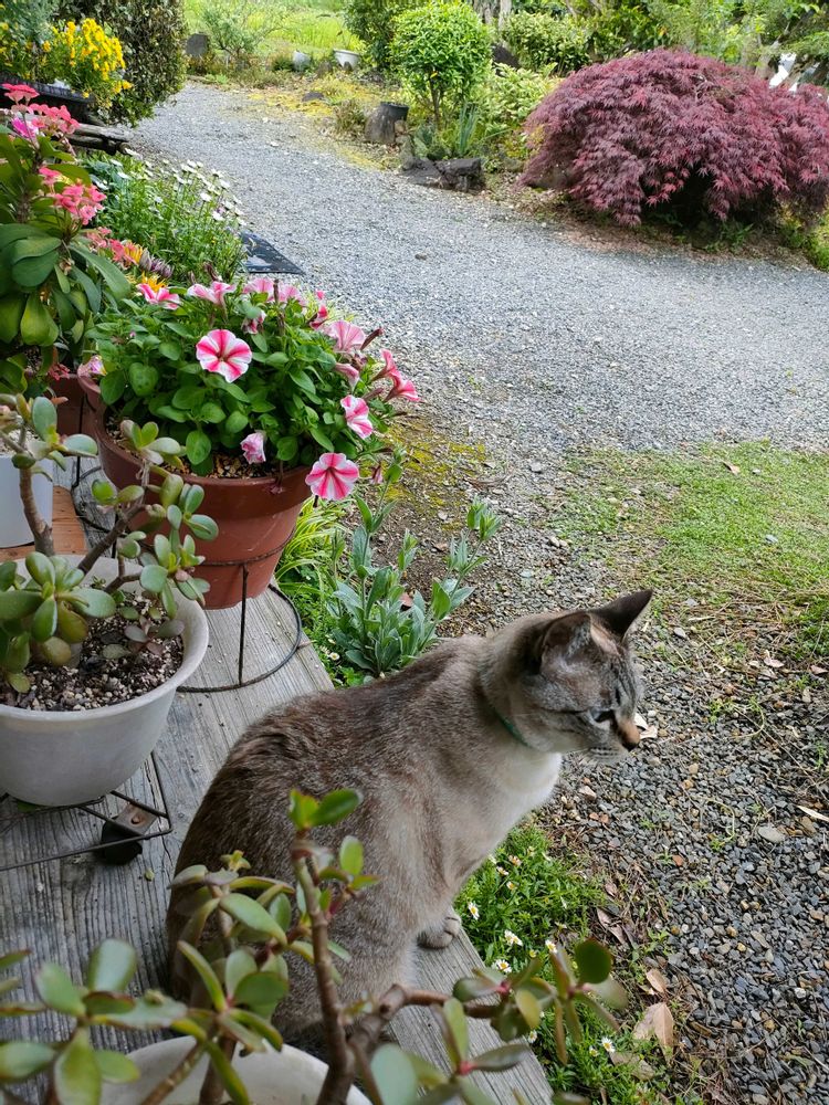 ネコちやん、誰をまってるのかな?癒されるお庭ですね😃