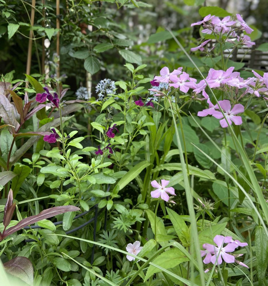 バックにアムソニア、手前は昨年お迎えしたフロックスブルームーン…のはずが!!ラベル違い?!どう見てもピロサだよ〜💦(゜Д゜)ナンテコッタ