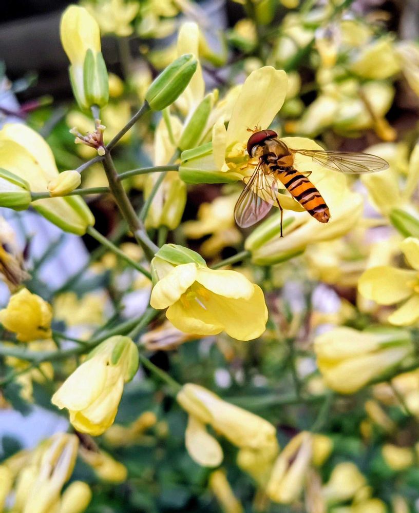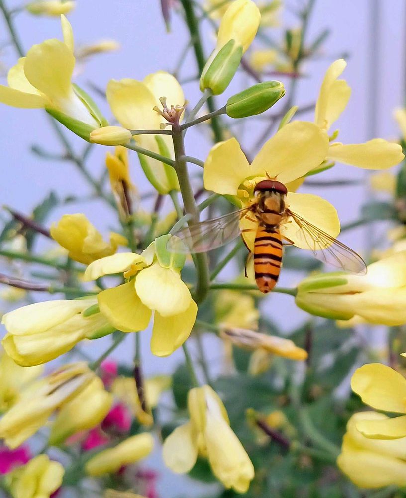 てんとう虫🐞さんは一匹だけですが、ヒラタアブ🐝さんは葉牡丹のお花のあちらこちらにいます☺️