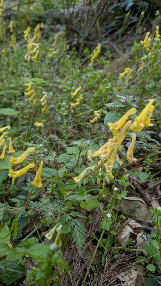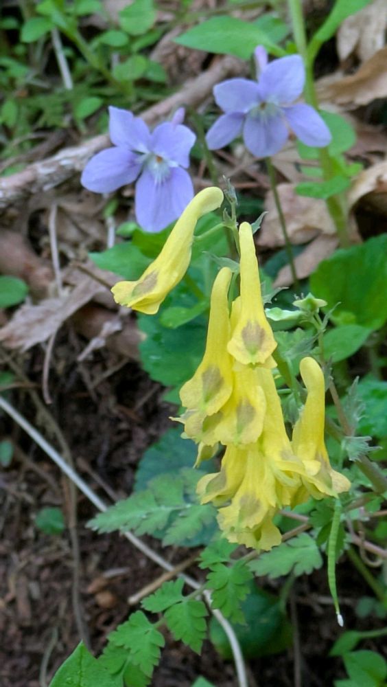 バックに見える紫色の蕾はムラサキケマン🟣 タチツボスミレとも同居していたりする月曜日にビタミンカラー🏷