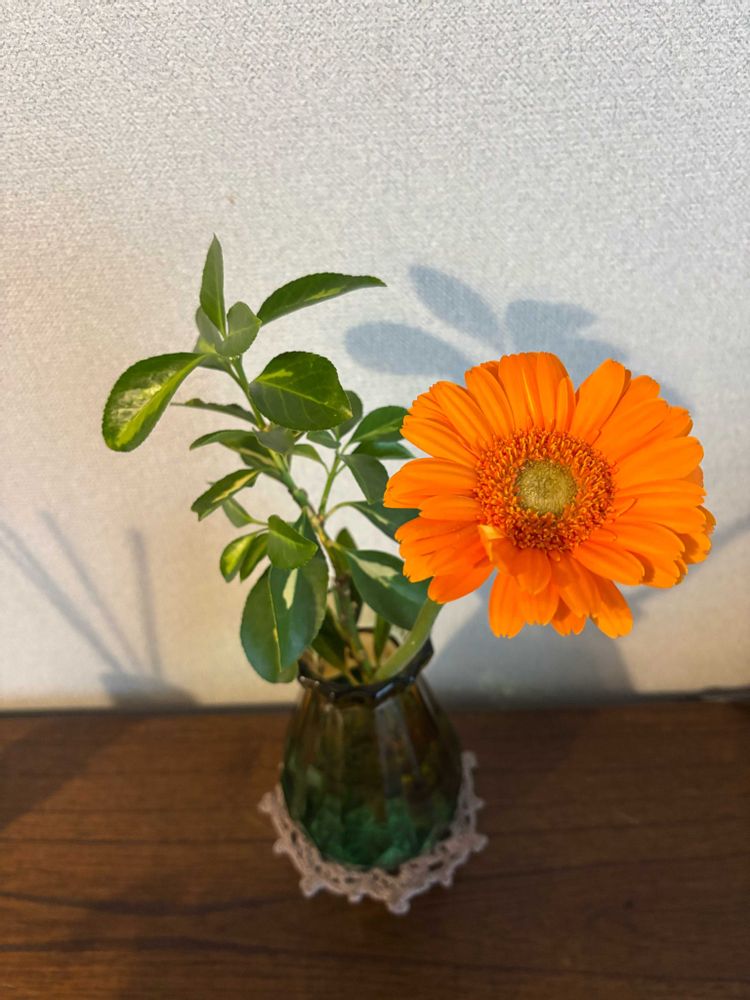 オレンジのガーベラ 緑の葉っぱとで元気出ますね🎵