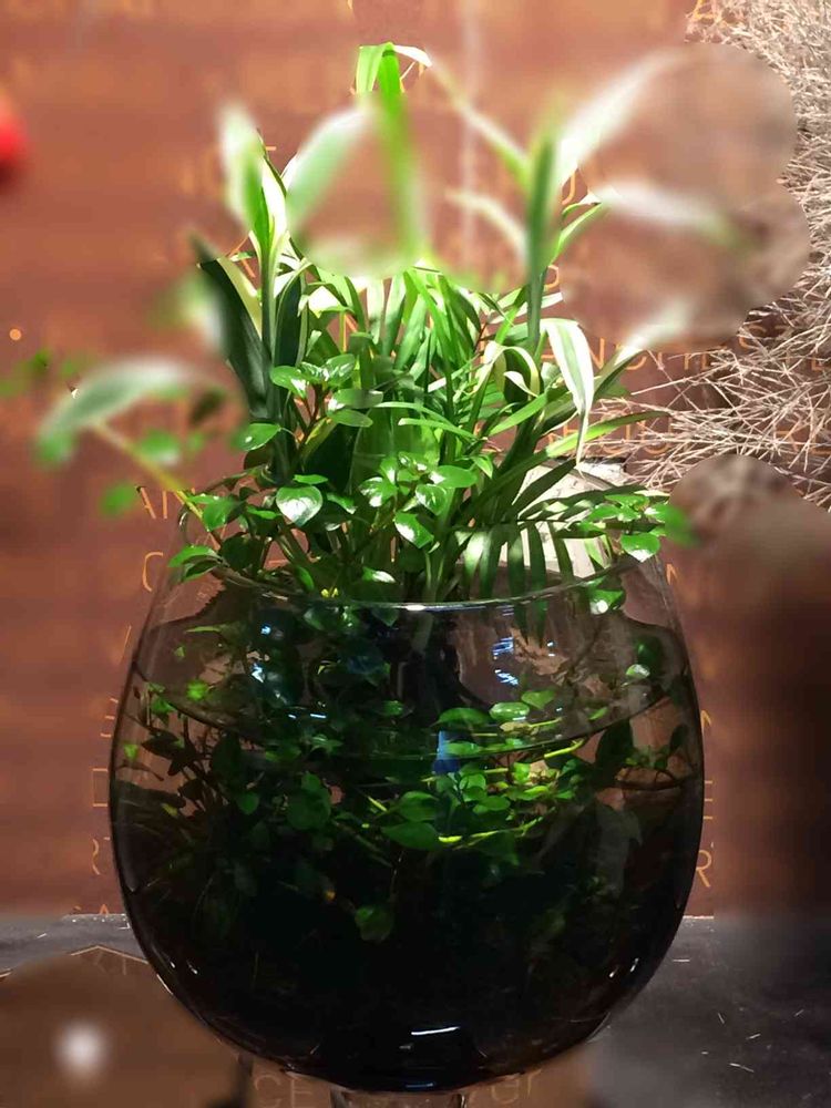 上には増やした観葉植物の苗を水苔でまとめて、下には水草を植え込んであります。