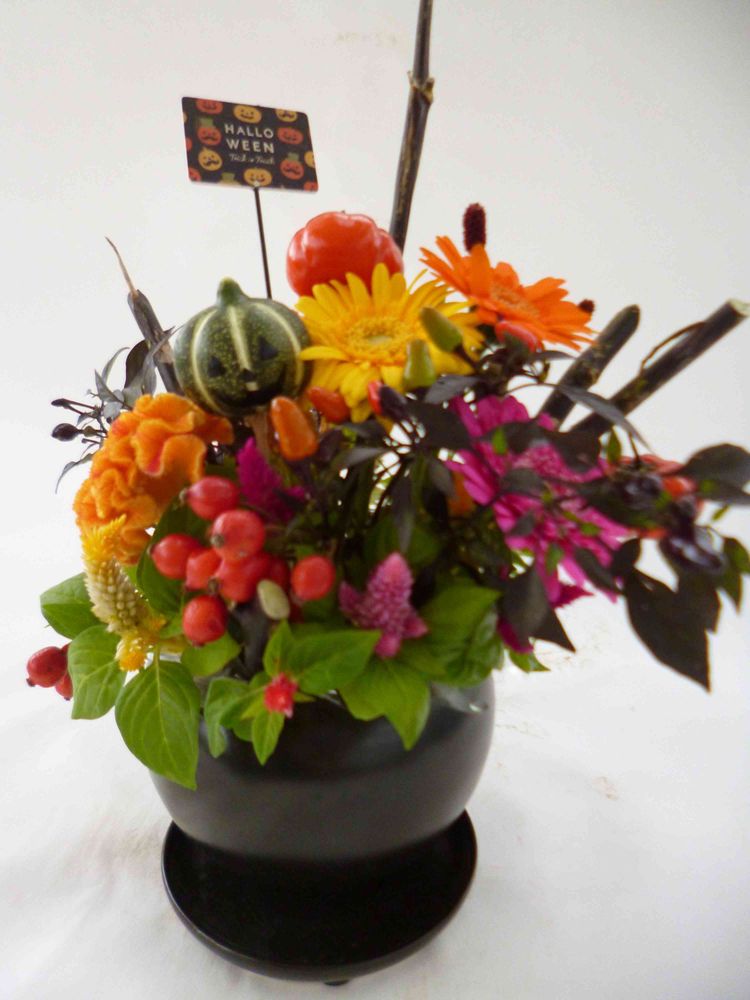 お店のスタッフがハロウィンのかわいいアレンジを作ってくれました!!POPなカラーがお部屋を暖かくしてくれそうですよね♪