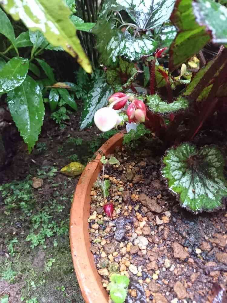 雨の中レックスベゴニアの蕾がもうすぐ咲きそうです👍。