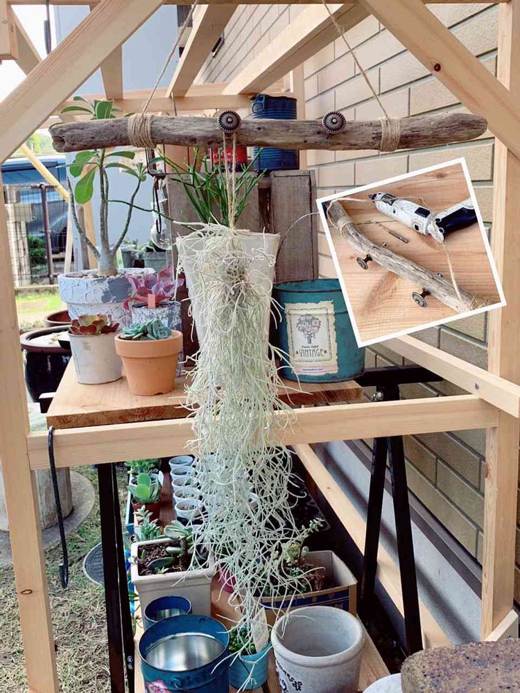 流木に吊るすつもりにはしてたんだけど、そのまま吊るすのもな〜…となり100均でグルグル回ってこれになったよ😁
