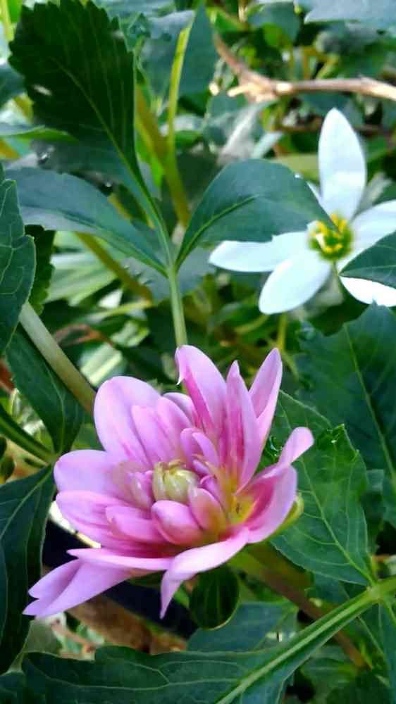 ダリアを撮ろうとしたら、奥にゼフィランサスのタマスダレを見付けて