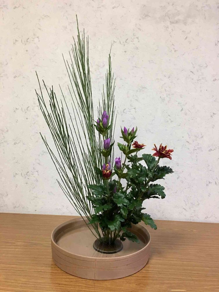 今回のお稽古🌼、未生流の基本形、個性盛花、直立型。