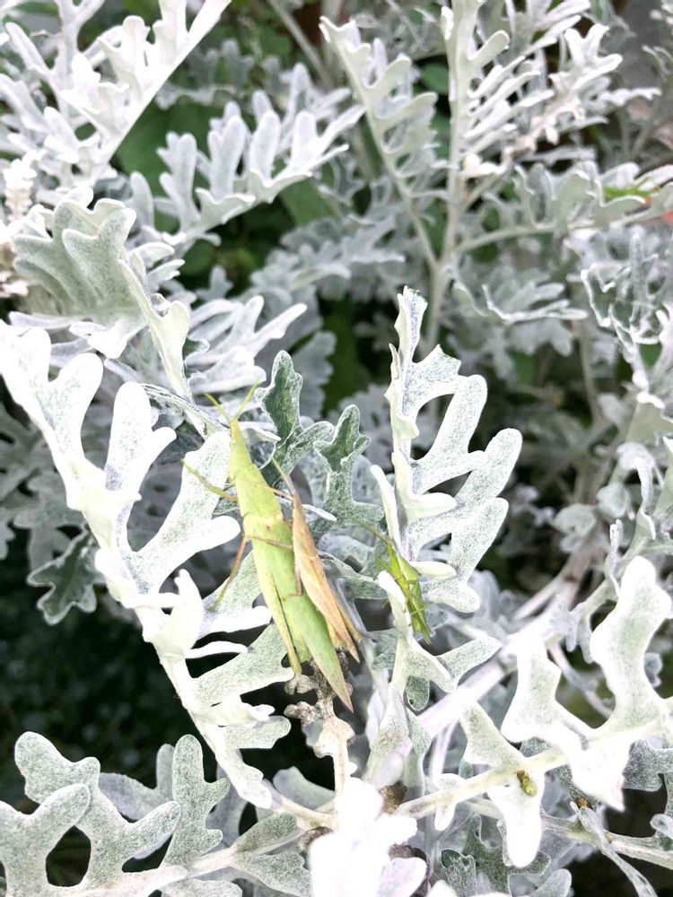 シロタエギクに、色違いの親子?夫婦?のバッタがいました😊
