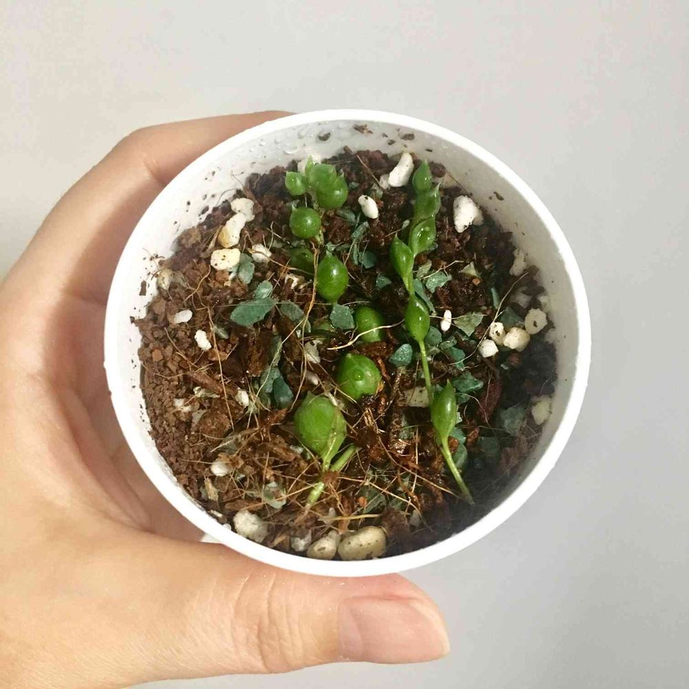 右の子も薄く土をかけておいたんです。でも、シワシワになったので、もう駄目かなぁと土から出したところ先端にちっちゃな根っこ発見😆