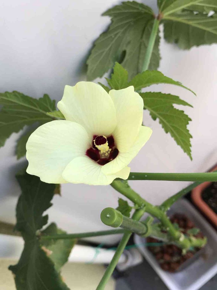 今朝、室内から洗濯機の脇に出してたオクラの花が咲きました。