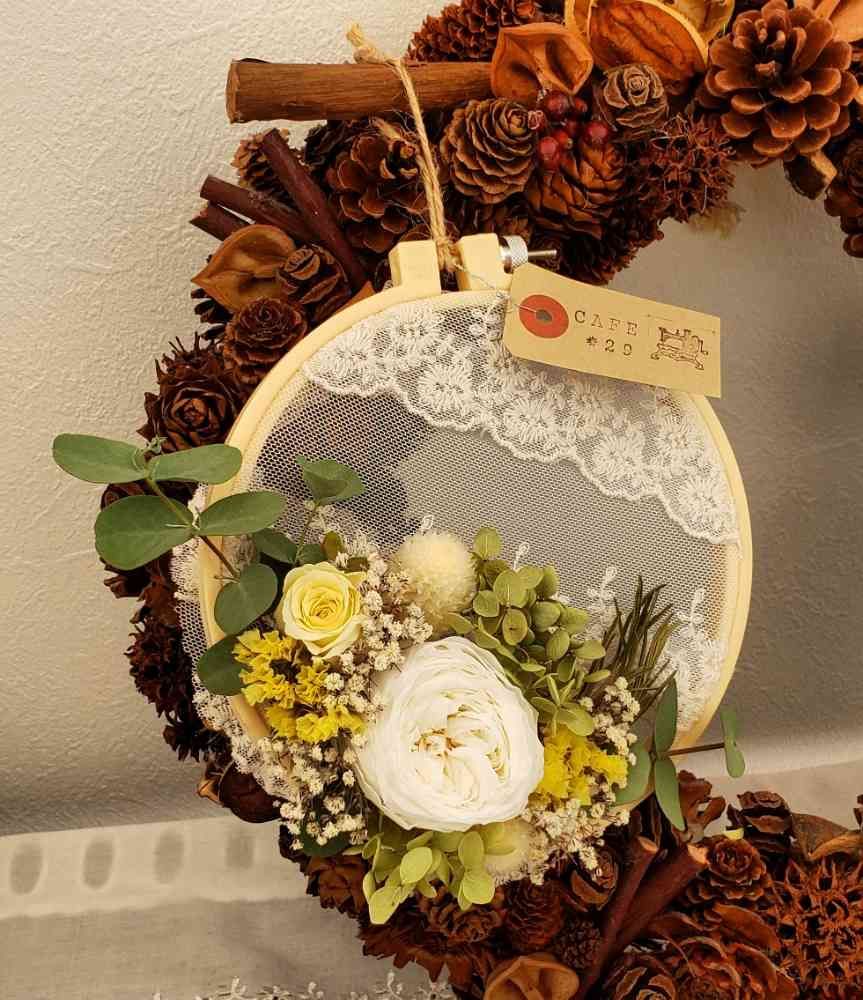 プチプラ花コーデ優秀賞賞品で頂いた書籍を参考にブリザードフラワー&オウチのドライフラワーで刺繍枠アレンジ