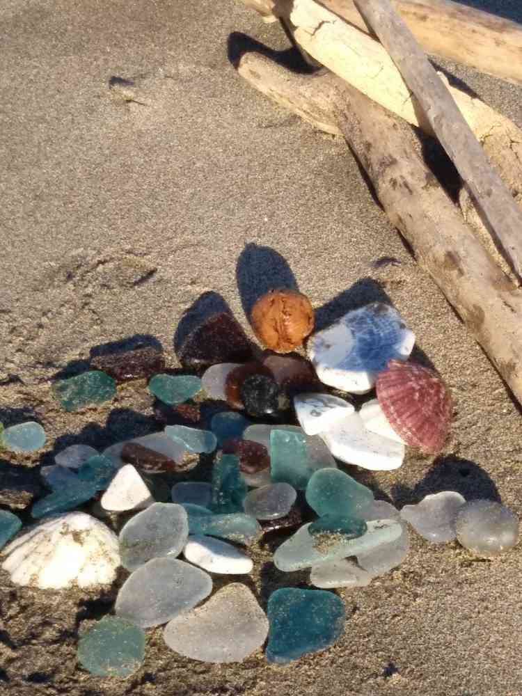 毎回シーグラスや瀬戸物の欠片変わった石貝殻流木いろいろ拾ってきます。