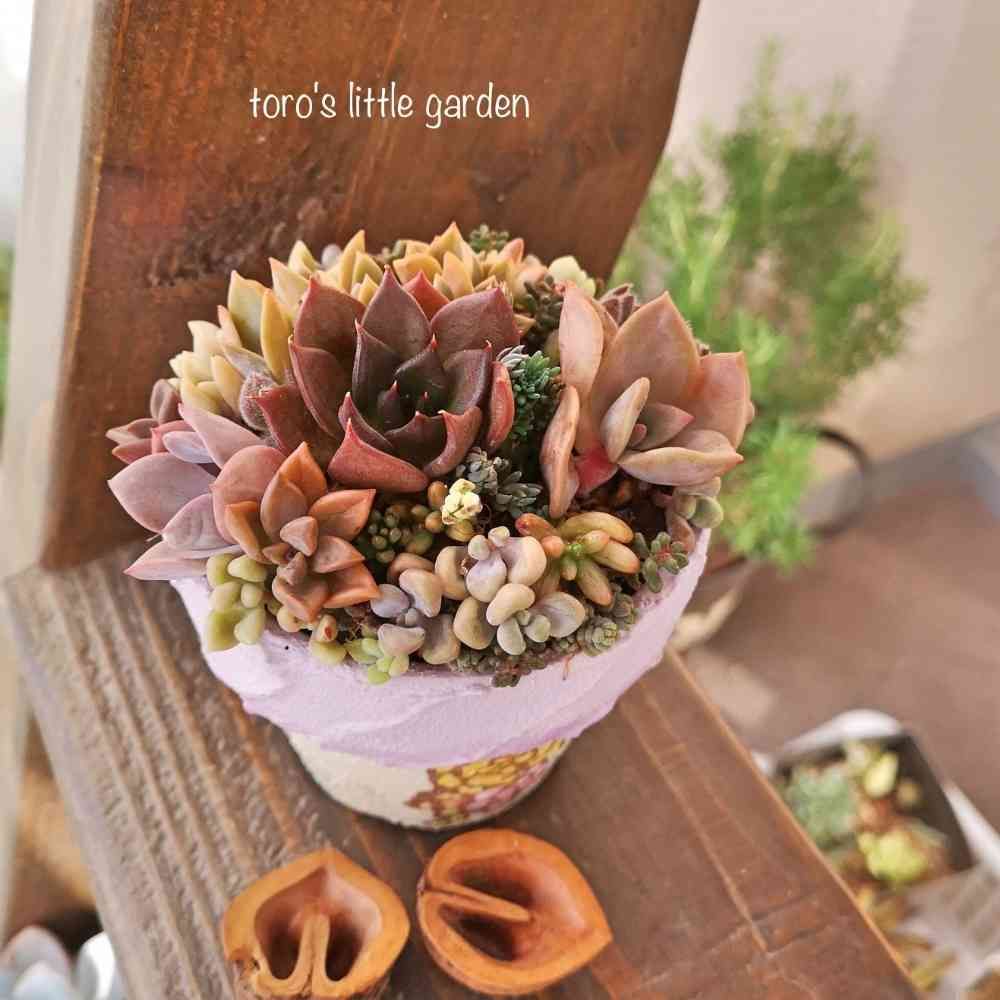 鉢がかなりラブリー系だから、多肉は落ち着いた色にしようと思って寄せたんだけど、春に寄せたから秋らしいとかは思いもよらず😅