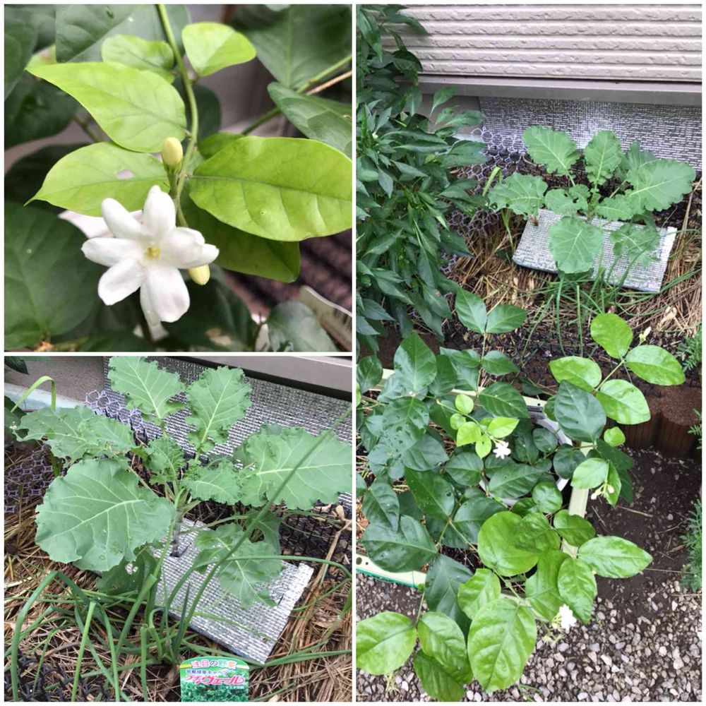 プチヴェールのまわりにも、トウガラシ、マリーゴールド、コネギ、ニラ、ついでにジャスミン(コレ効いているのかは?)