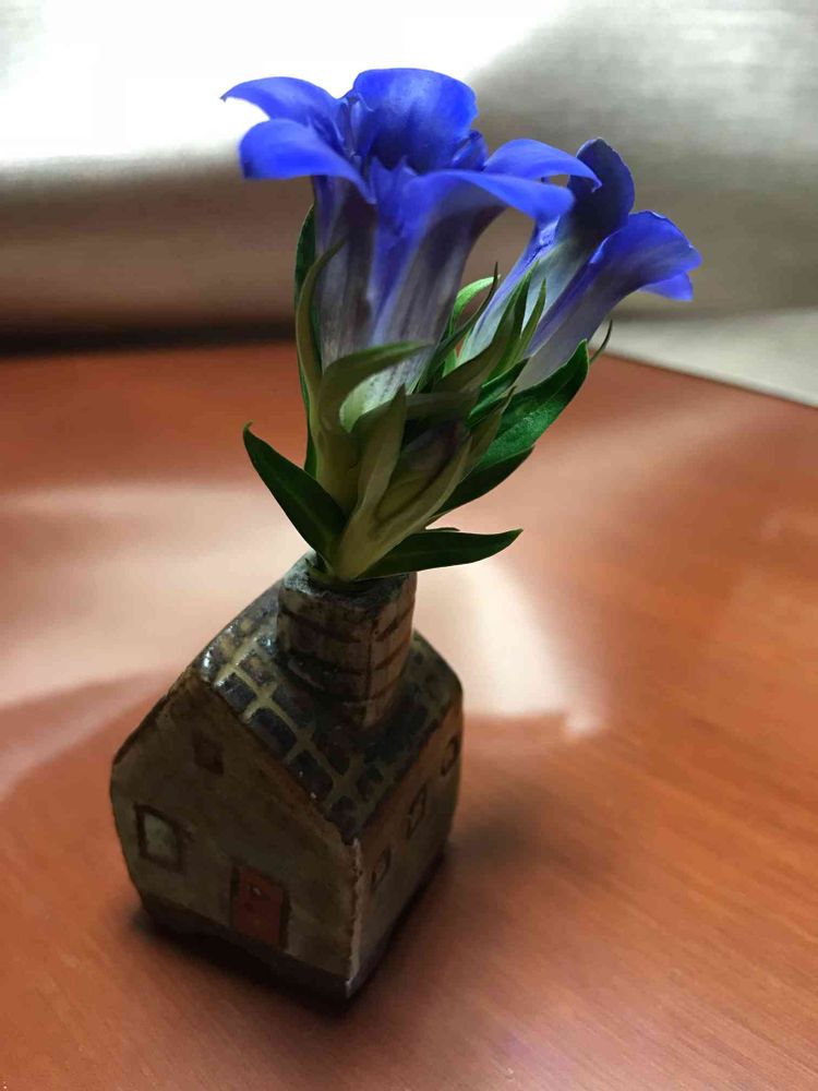 笹リンドウ(切花)を買ってきました。花瓶に活ける時、下の方のお花を切ってしまうので、お気に入りの小さなお家型の花瓶に活けました。