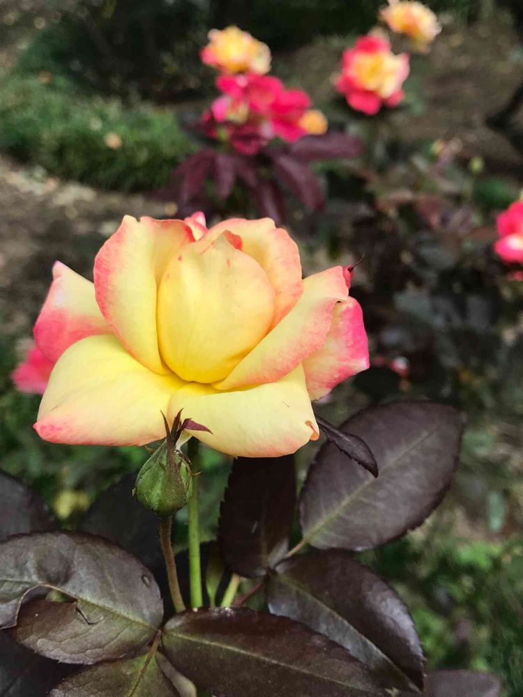 ピンクとイエローの可愛いバラ🌹葉っぱがダークで秋薔薇らしいです🌹