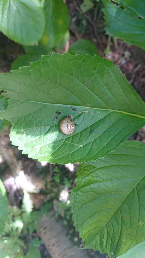 アジサイの葉に 小さなカタツムリ🐌 昔はアジサイと言えばカタツムリだったけど、最近は見かけなくなりました。大きくなるまで天敵にやられないでね