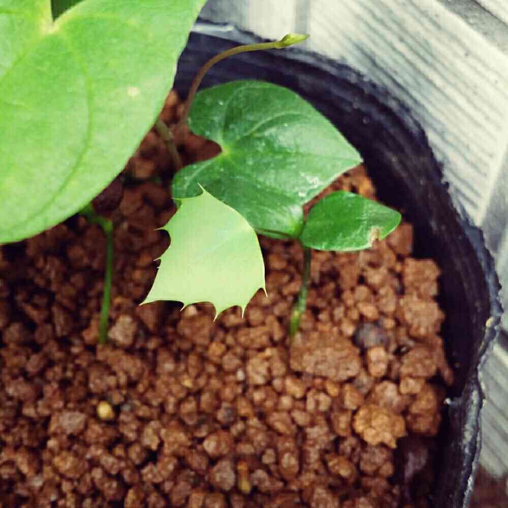 適当に色んな種をまき、実生苗を育てているポット。とげとげの葉が出てきましたが、なんの葉なのやらわかりません。