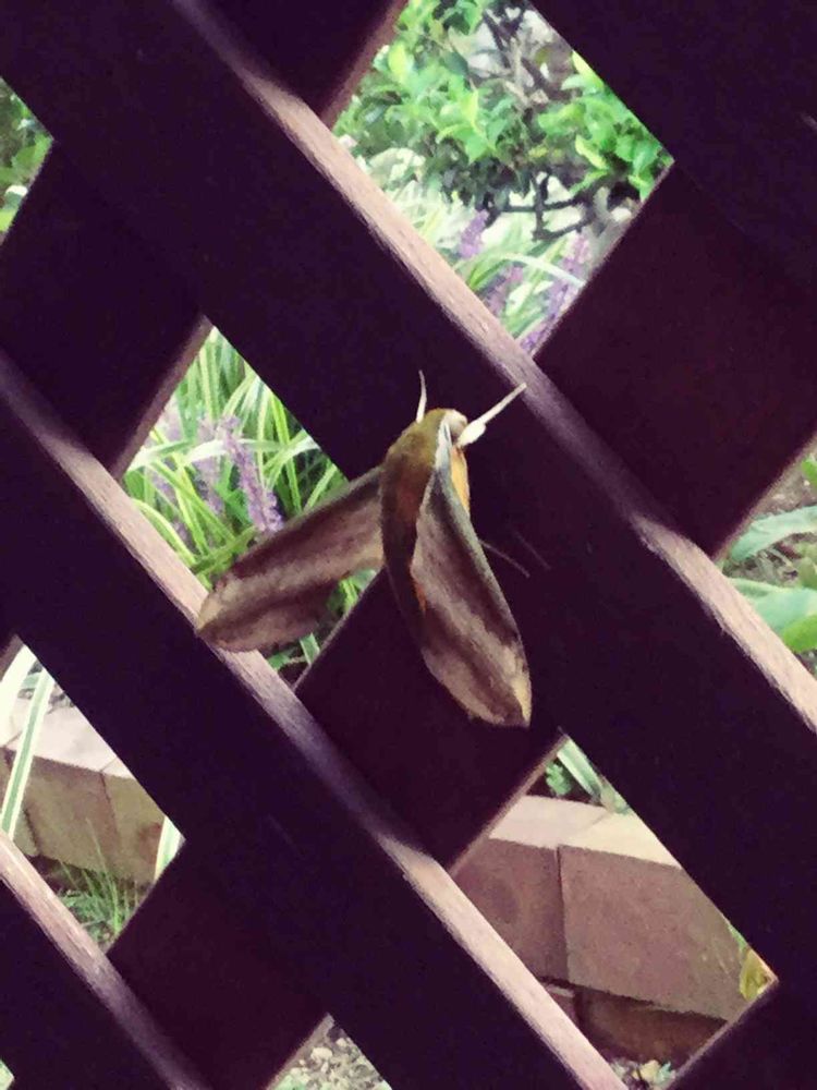 この蛾は多分、スズメガの仲間のキイロスズメですね。
