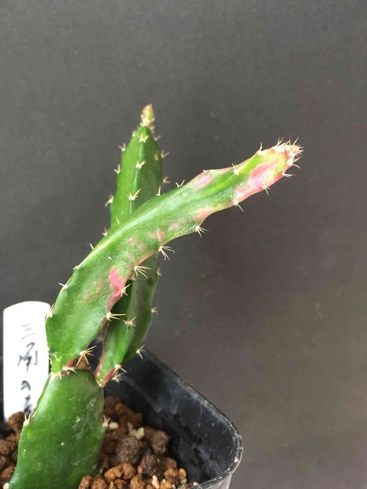 普通の緑の中にピンクの緋牡丹の色が所々浮き出ているとても怪しい魅力のあるキメラ植物です。