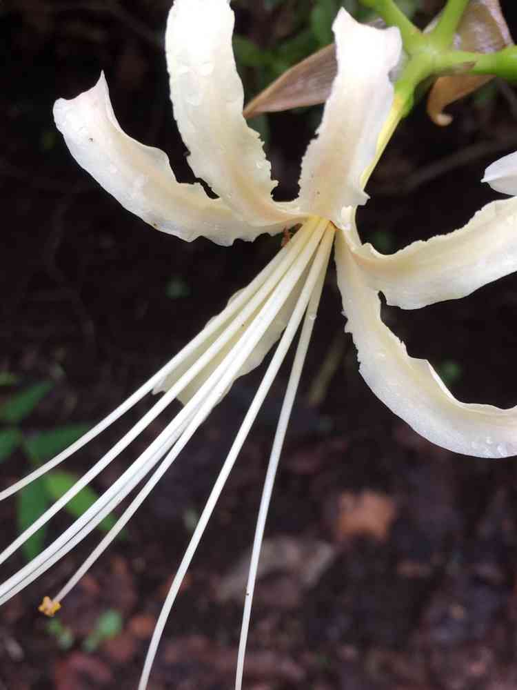 白い彼岸花は、黄色の花と赤い彼岸花との交雑種とされており、繁殖力が弱く、とても珍しいそうです。