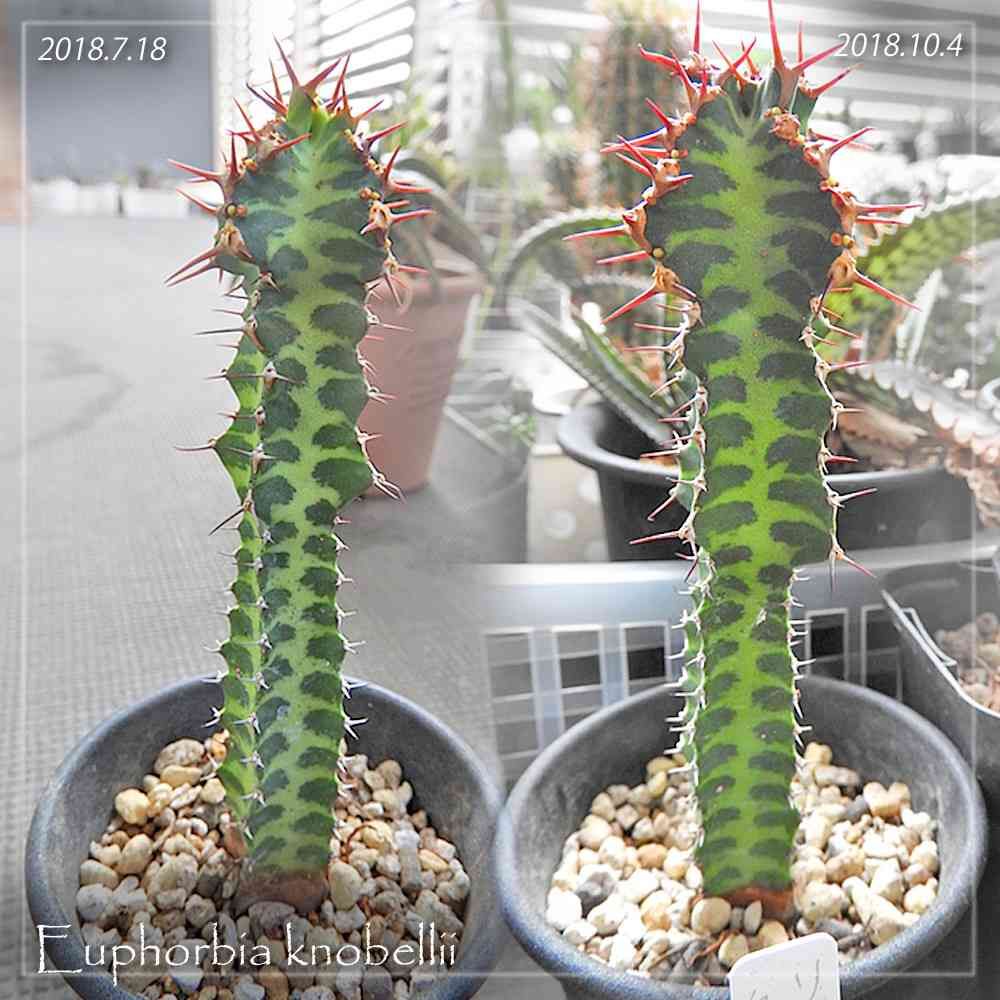 ユーフォルビア、ノベリー(閃光閣)。こっちは育て初めて2ヶ月。アマックに比べて成長が遅い。棘ひとつ分くらい大きくなった……かな?