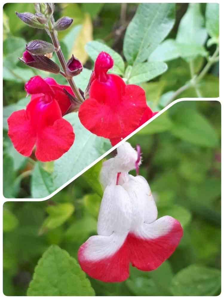 下側の赤白混じりのセージは、友達から枝を頂き、挿し木して初めての花です。