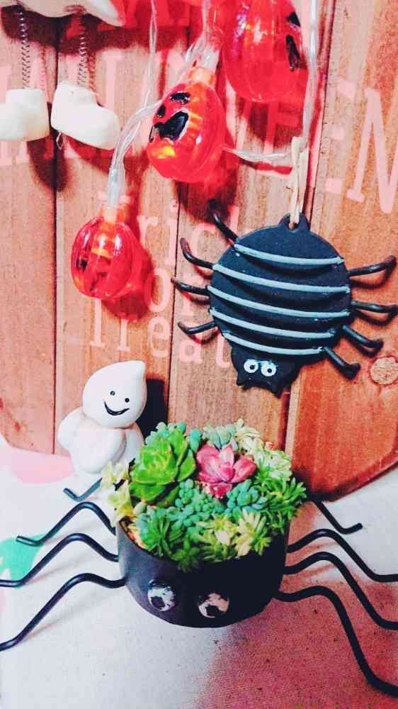 100均の蜘蛛の飾り物にちまちま寄せ植えしました🤗